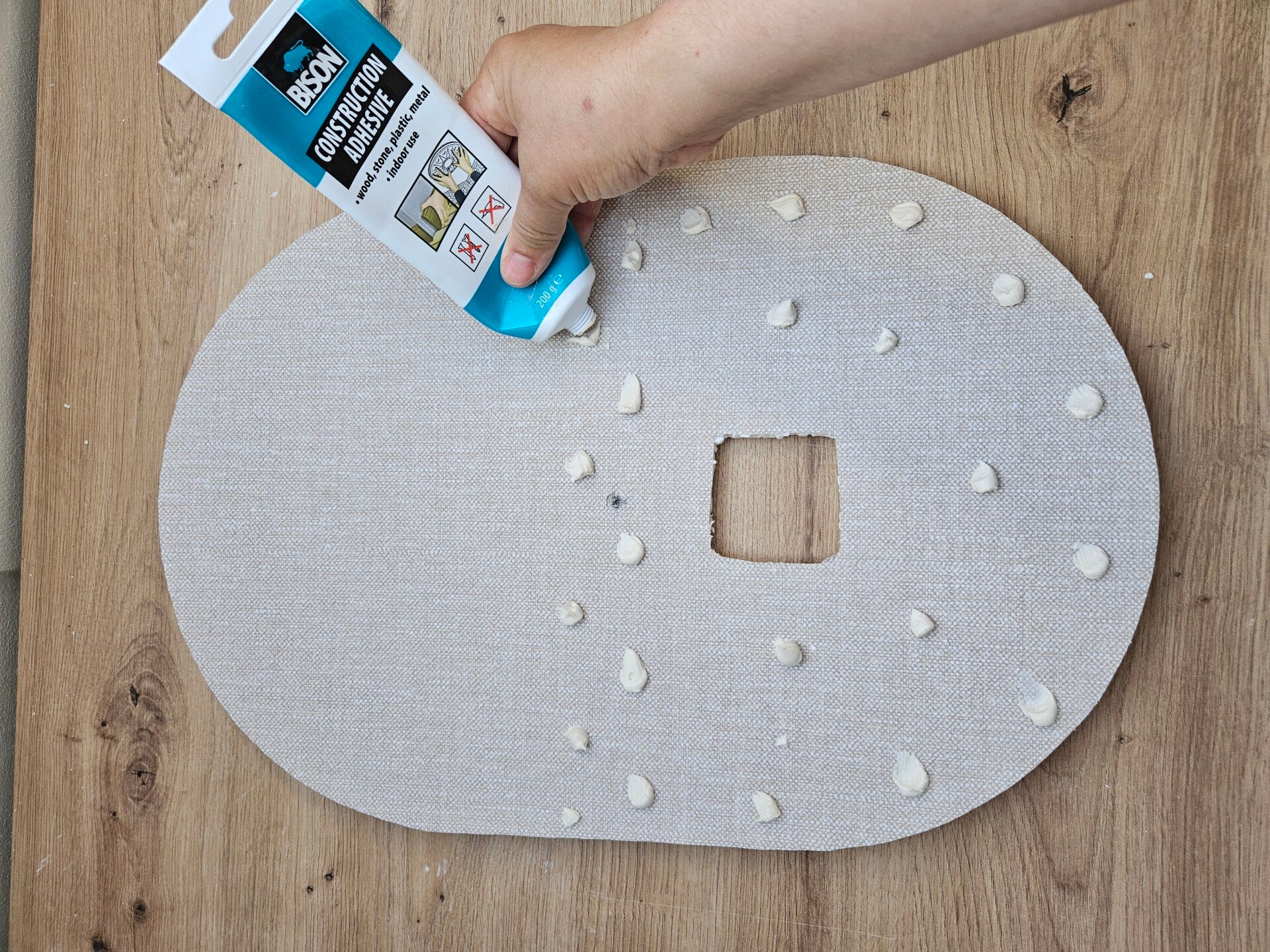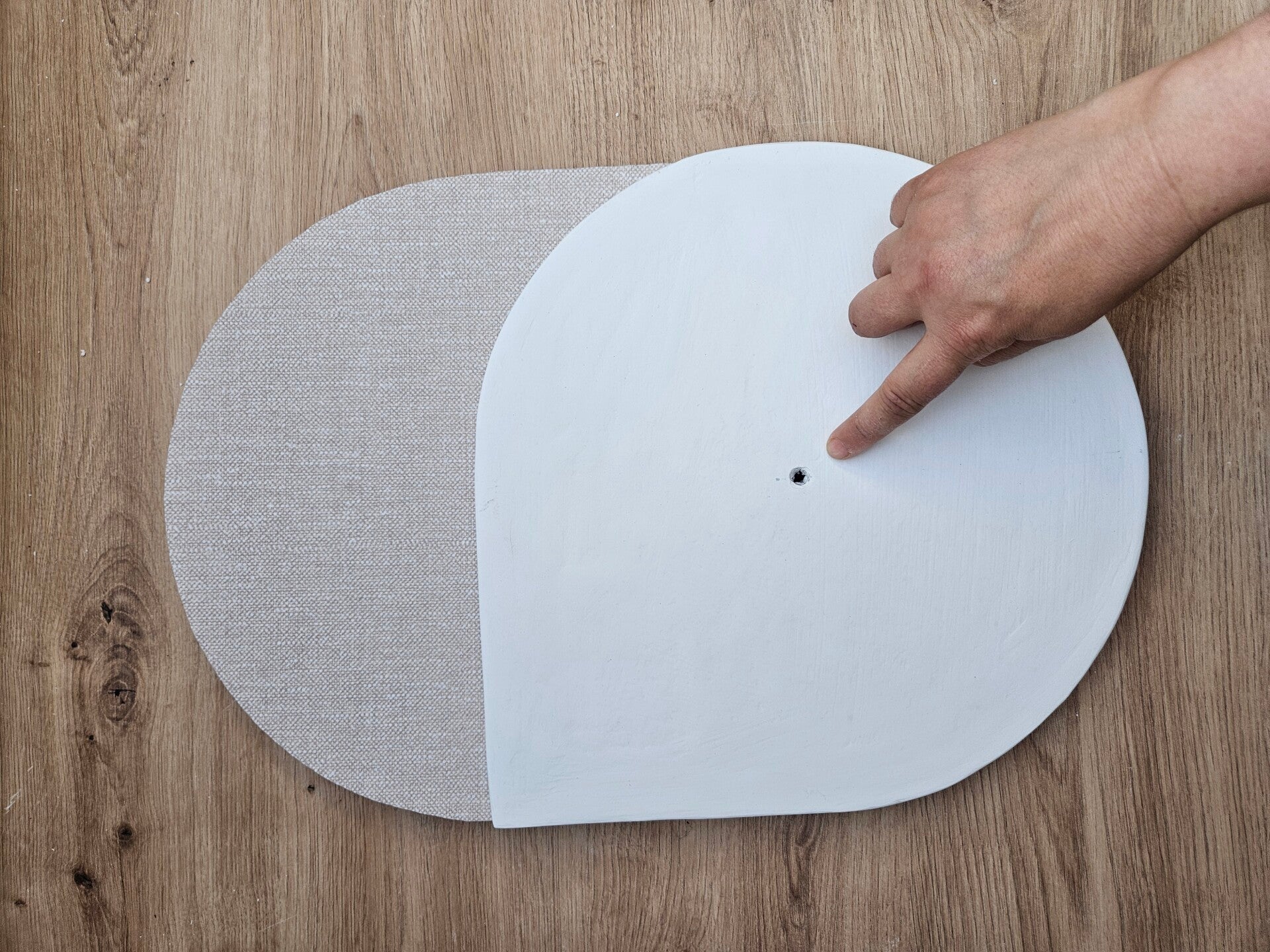 Voor het gelaagde effect van de klok maak je een tweede zelfde vorm. Leg vervolgens hiervoor de eerder uitgesneden basisvorm even opzij. Pak je placemat opnieuw, maar kantel deze dit keer horizontaal (in plaats van recht omhoog/verticaal) en leg hem op een nieuw stuk piepschuim. Doordat je de placemat kantelt, ontstaat er een zachtere, organischere vorm die mooi contrasteert met de onderlaag. Trek de omtrek over en teken handmatig een vloeiende onderrand zodat het goed aansluit op de basisvorm. Snijd ook deze tweede vorm uit met je hobbymes. - Bovenlaag bewerken met muurvuller